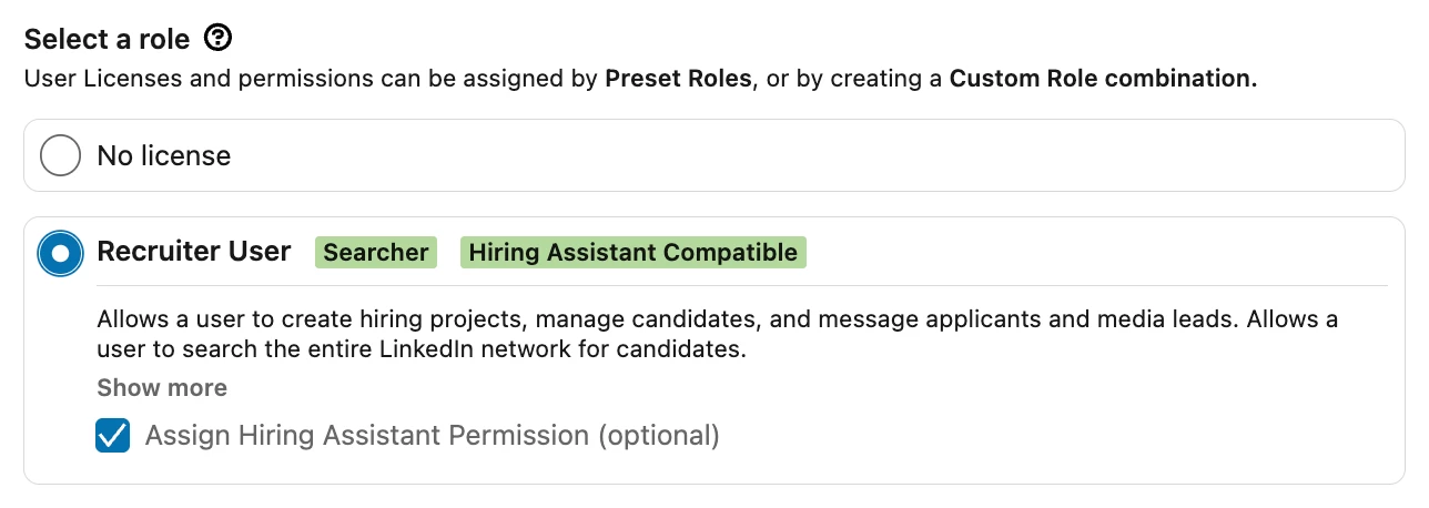 🚨 Important: Hiring Assistant is not automatically assigned to a Recruiter license. Please follow the steps below to enable Hiring Assistant licenses for both new and existing Recruiter seats.