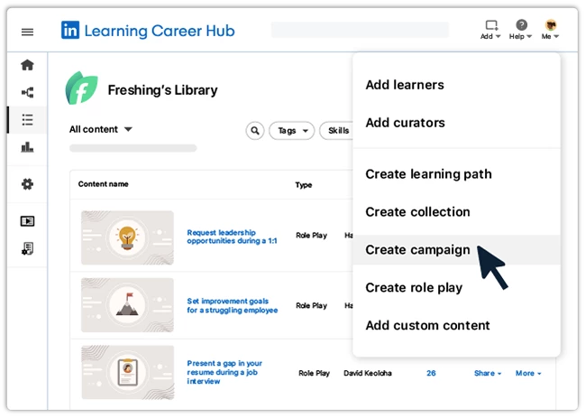 Seamlessly integrate role play practice into your learning programs by curating them in learning paths, collections, and campaigns. From there, you can recommend and assign them directly to learners.