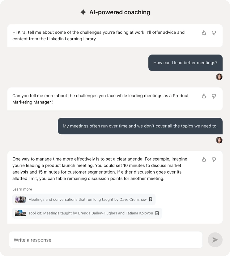 Tools like LinkedIn Learning's AI powered coaching exemplify how AI can provide real-time, customized advice and course suggestions based on user queries and feedback. This technology adjusts guidance according to job roles and specific challenges, enhancing the relevance and impact of learning. Additionally, AI-driven mentorship programs connect experienced employees with those seeking guidance, fostering knowledge transfer and creating a collaborative learning environment. By integrating AI into learning, mentorship, and career coaching, companies can align individual and organizational objectives, driving both employee success and overall achievement.